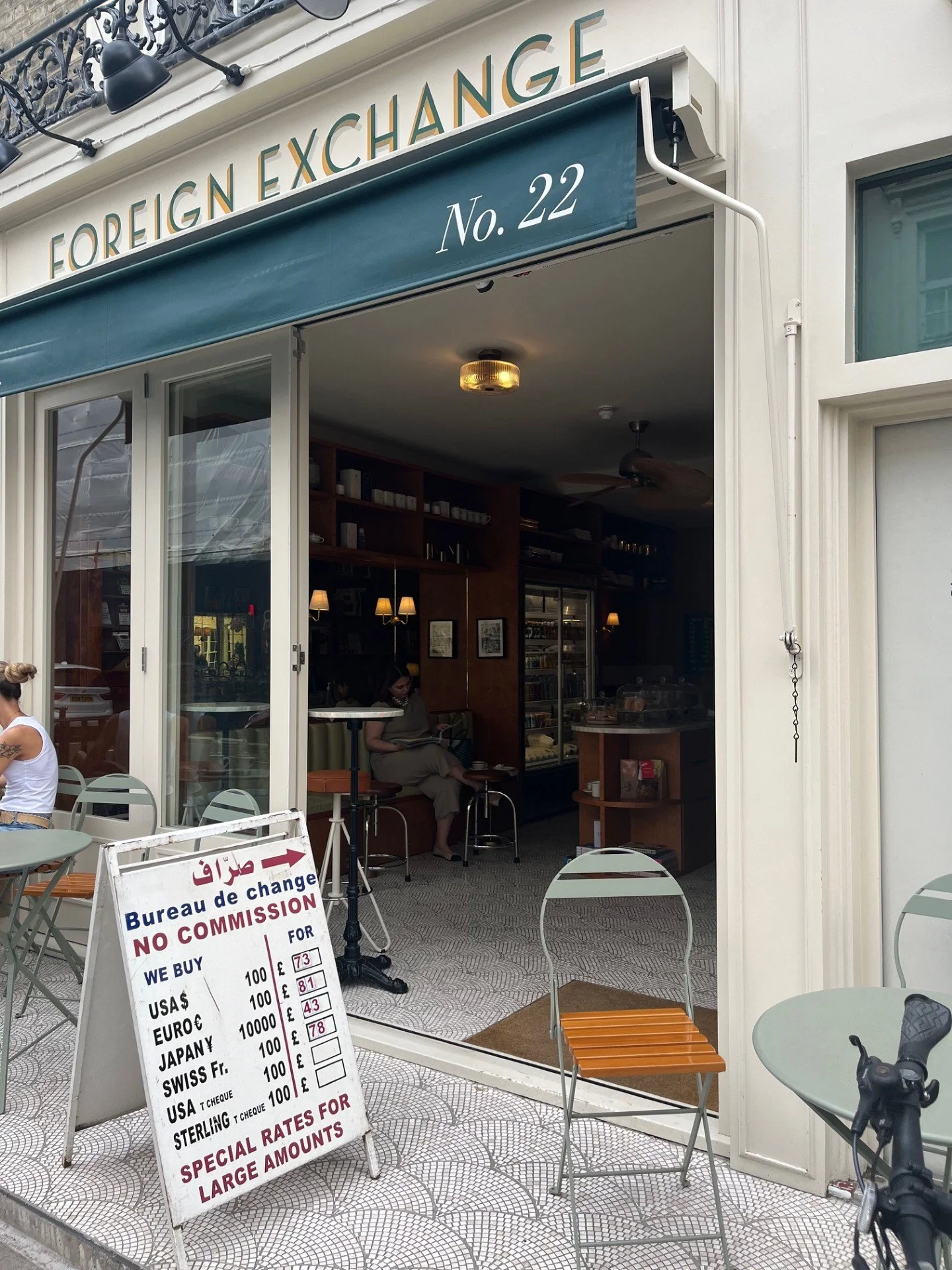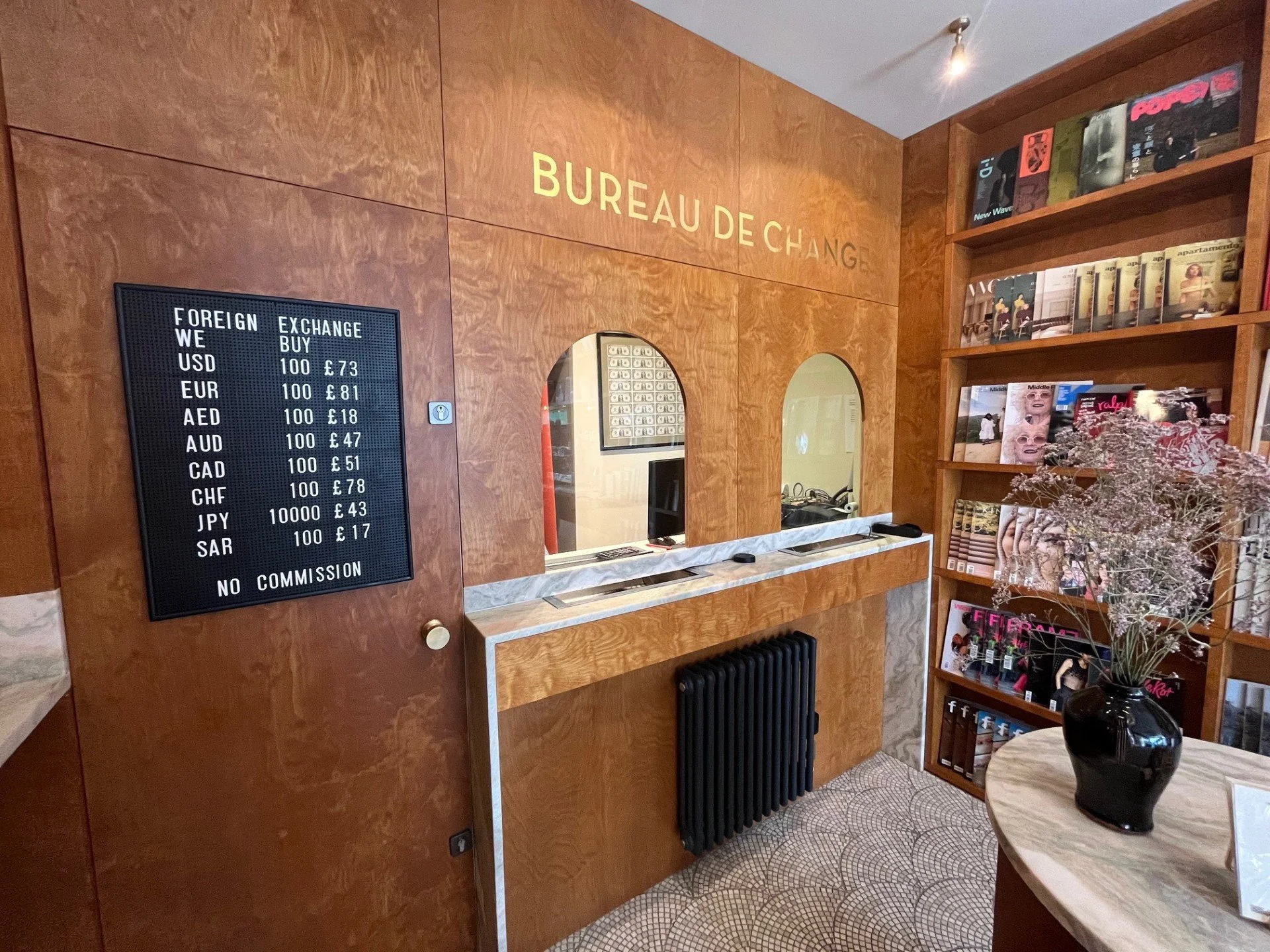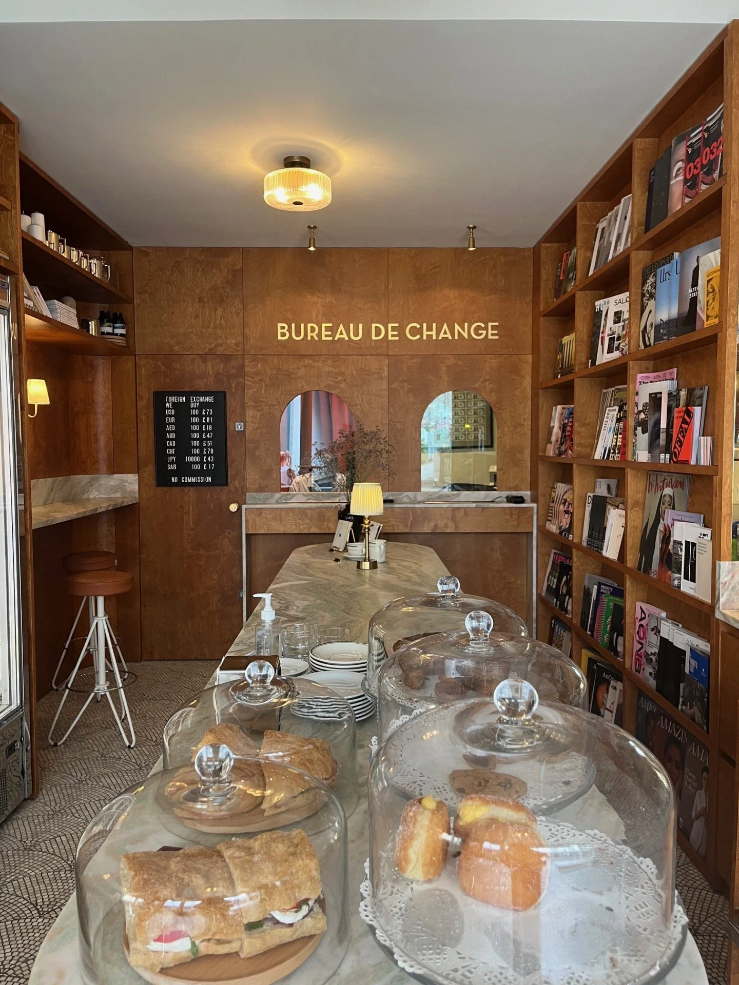 Behind a curved glass counter on a quiet Bayswater corner, someone is calmly exchanging euros for pounds. A few steps away, a barista pours a flat white while a customer flips through a Kinfolk. At first glance it feels like an oddly charming scene in an arty movie (and that’s exactly the point!)