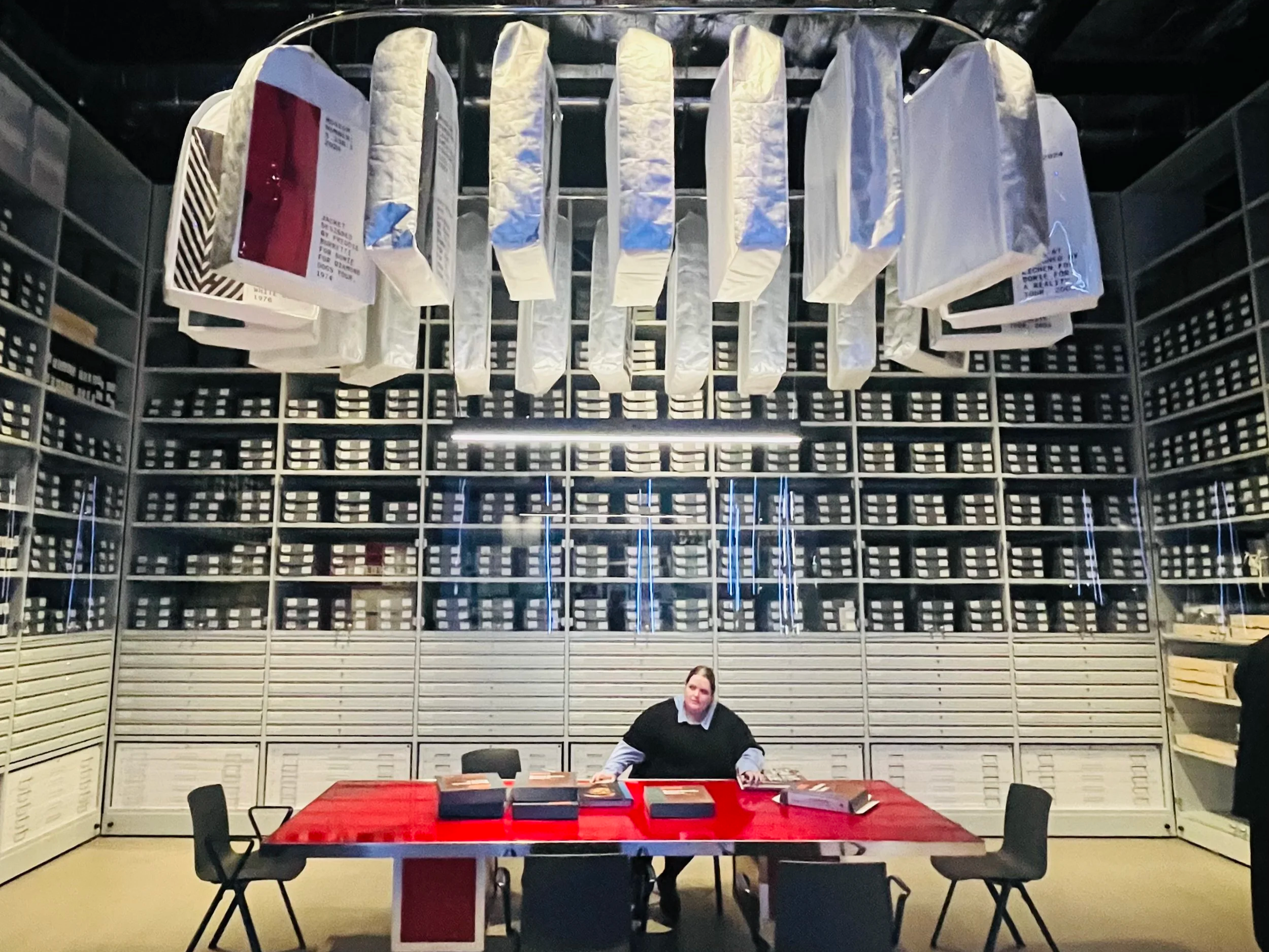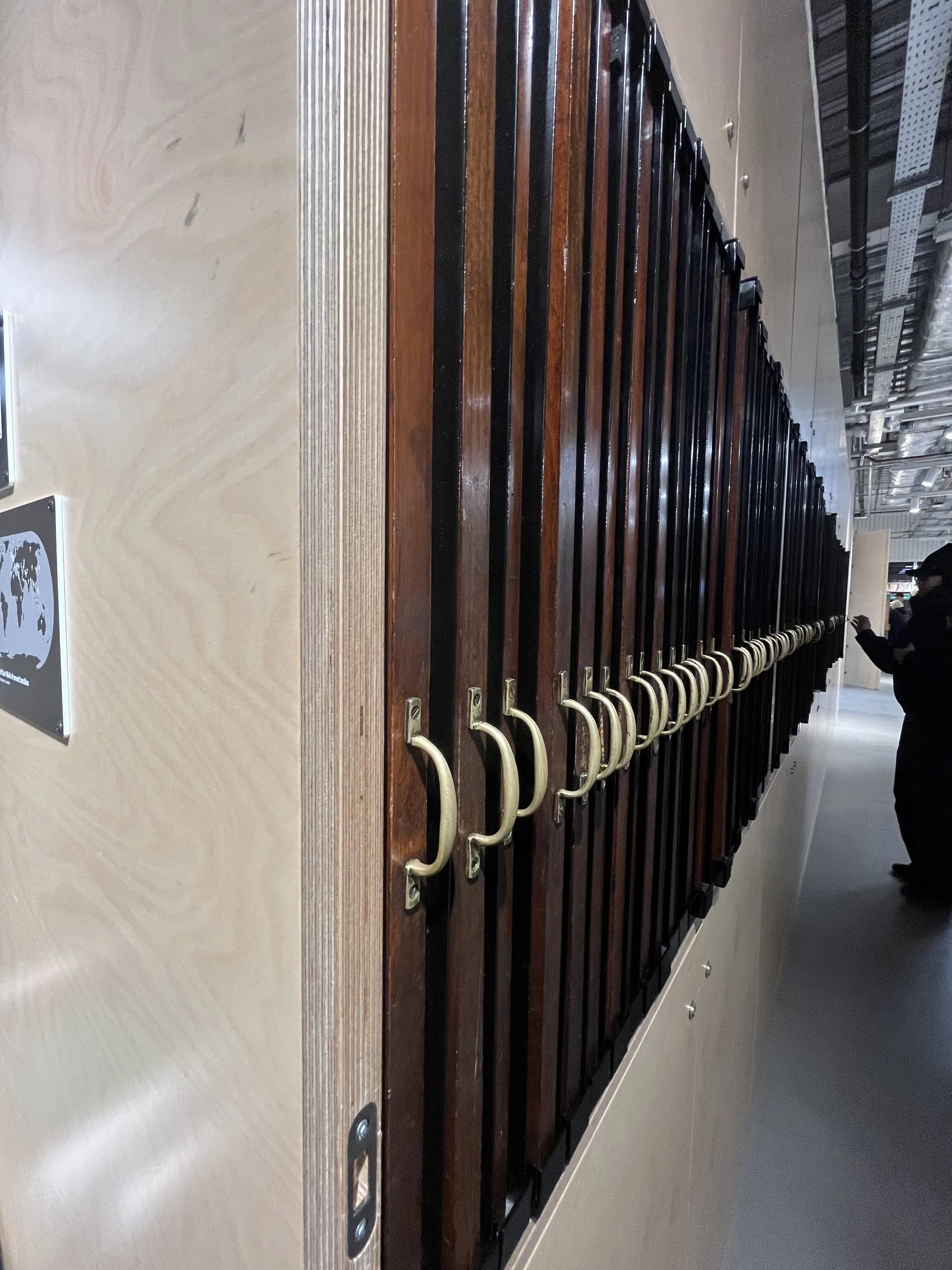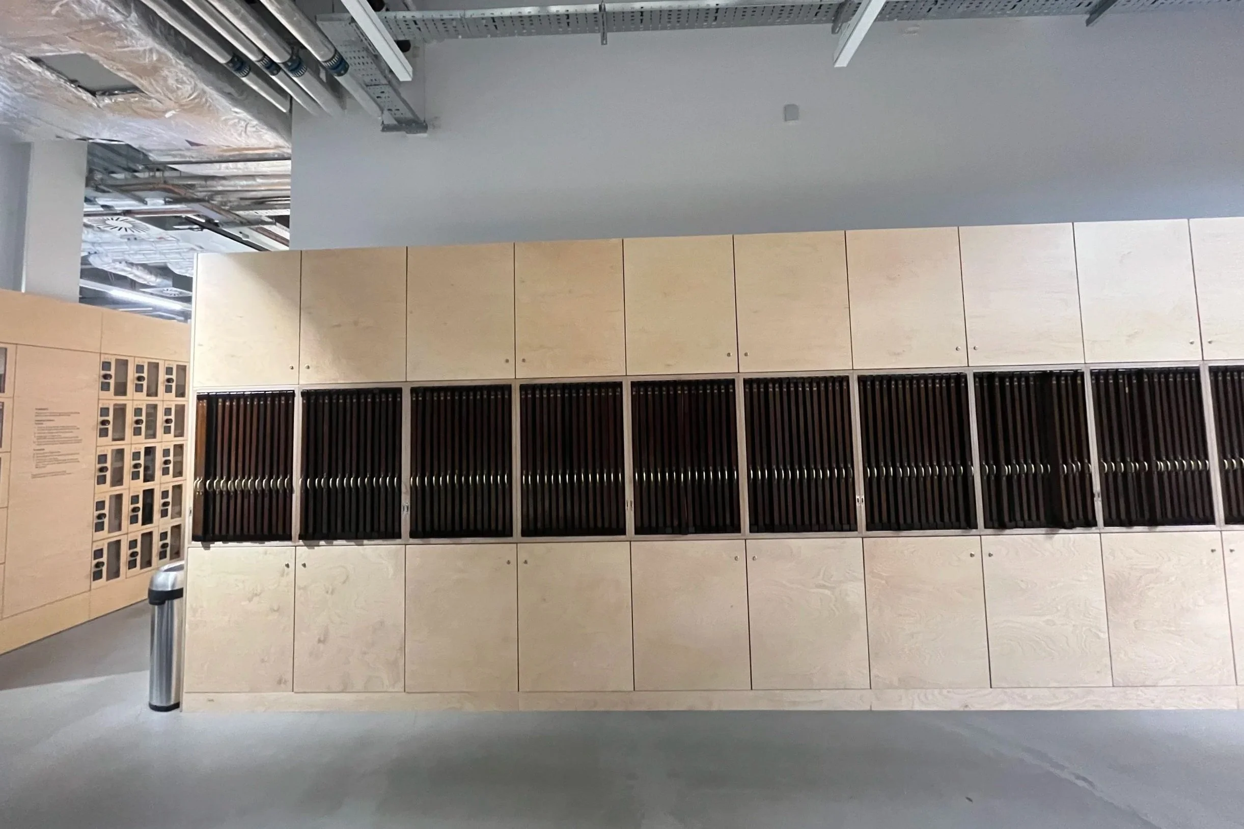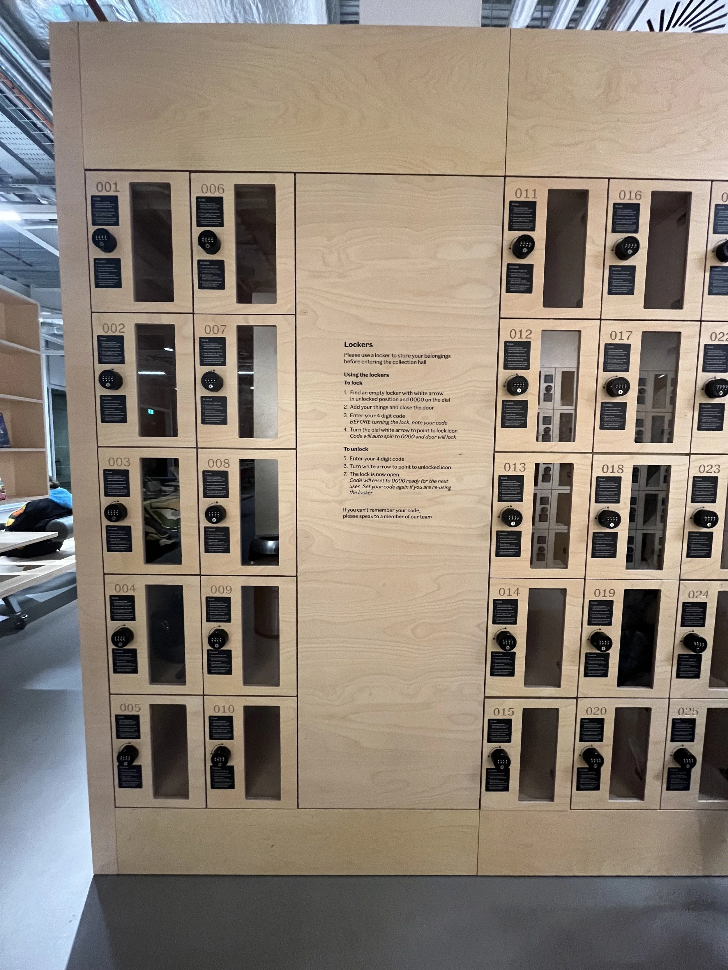 Upon arrival, everyone is strictly asked to store bags and coats in a clever and very functional locker system. But it’s not all procedure. Right from the get go, V&A East whets the visitor’s appetite, with a huge textile archive, beautifully displayed right next to the lockers.