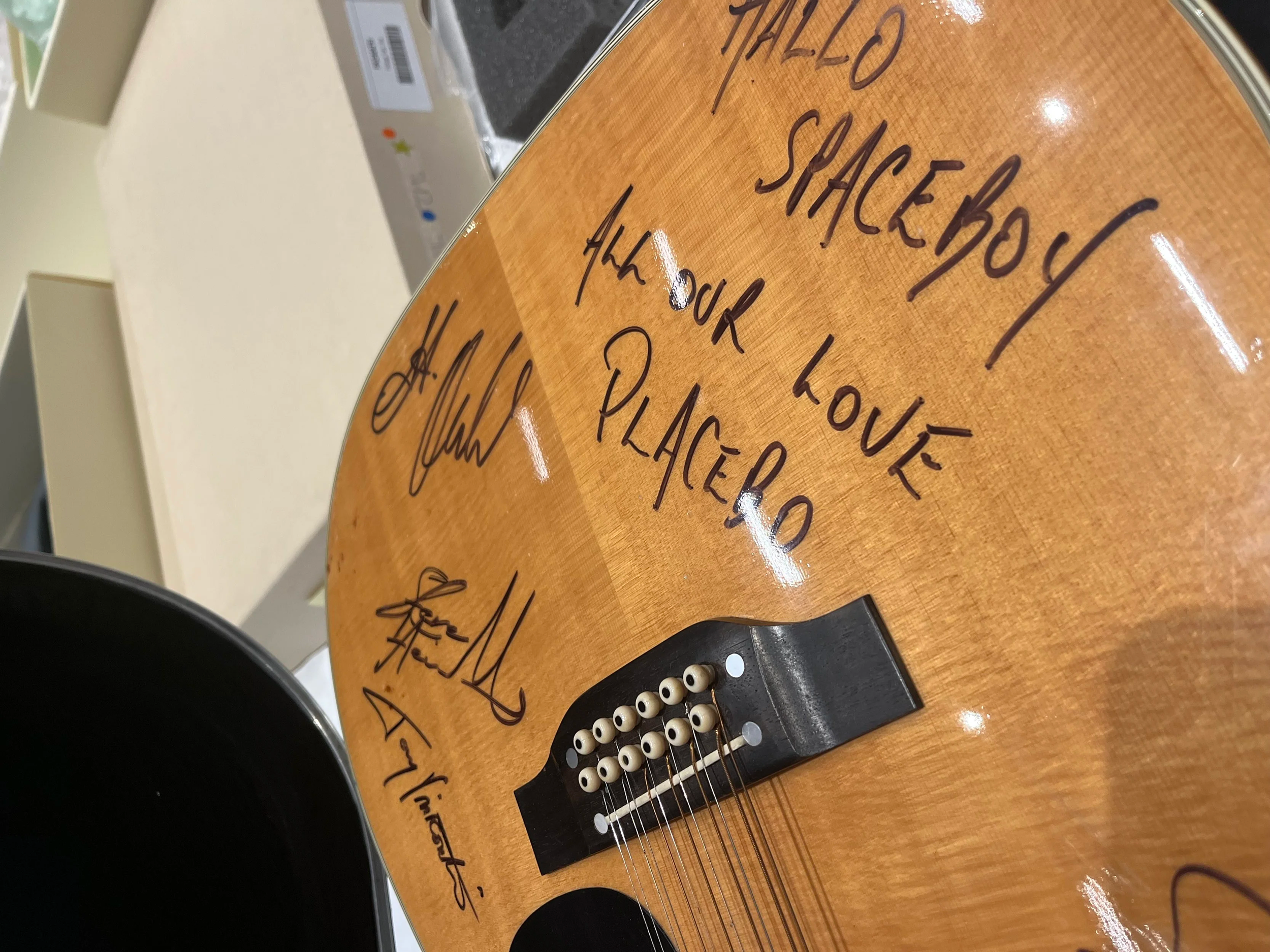 We got to feel and touch a variety of suits, shirts, shoes, macs, jackets and coats, as well as some of the really daring costumes from Bowie’s Ziggy persona. Some of his suits were from Alexander McQueen and Thierry Mugler - the Haute Couture quality clearly visible. It was fascinating to contrast the couture with the costumes, the latter being designed with crudely made, but hidden, straps, hooks, ties and built-in undergarments. We also got to see one of his very large Takamine 12-string guitars, signed by Placebo and other greats. Posters, jewellery, magnets and even a model prop for stage were all on display, just for our private enjoyment.