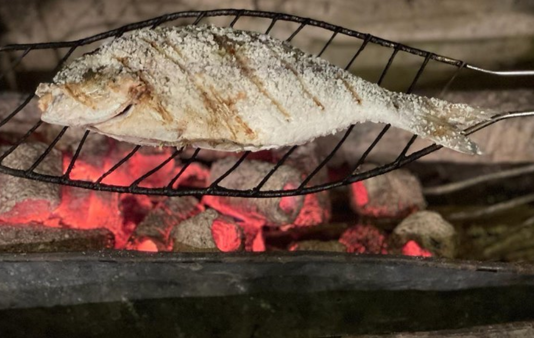A salt crusted bass, stuffed with lemongrass, makrut lime leaves and galangal, grilled over the coal at Kiln.
